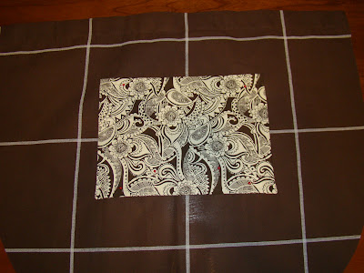 2.) Fold your shower curtain in half with the ring holes on the top and place you pattern on top of it. (You need 2 pieces of the patten for the 2 sides of the bag.)
