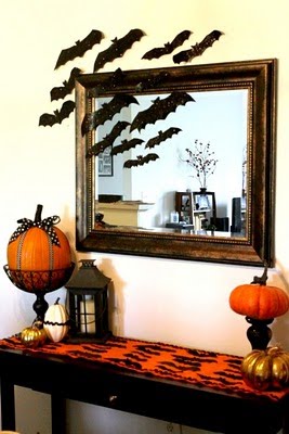 When there is a post with multiple great ideas, I can't help but highlight them. This post by Miss Lovie shows how to make an adorably spooky bat tablerunner, ribbon pumpkins and glittery bats to hang on the wall/mirror. Three-in-one rocks!