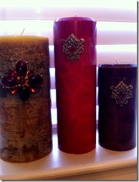 The Elephant's Trunk has a great idea I haven't seen before. She dressed up some plain candles with vintage brooches. They make the candles look so fancy!
